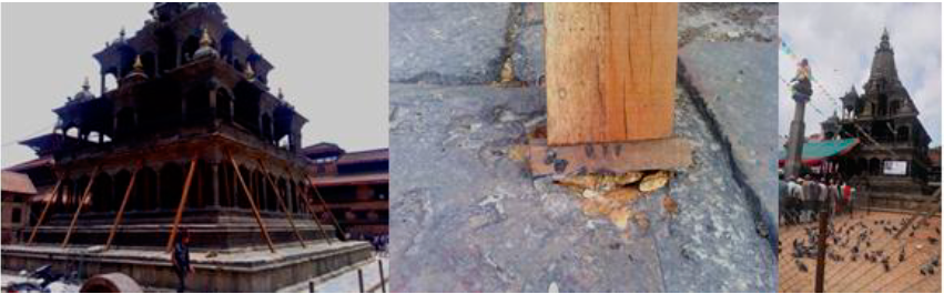 Da mesma forma, existem alguns casos em que a intervenção das autoridades locais danificou as estruturas do patrimônio cultural pós-terremoto de Gorkha (Figura 6). Suportes temporários de madeira foram erguidos sem qualquer propósito e sem o conhecimento da autoridade e sem consulta com a comunidade local. Os suportes foram removidos novamente sem qualquer informação ou avaliação de resistência ou precaução necessária. Isso demonstra falta de apropriação no nível do governo e falta de consulta à comunidade profissional e local. O mundialmente famoso templo de Krishna de Lalitpur foi danificado pela intervenção irrefletida do município com a elevação de pedras de madeira imediatamente após o terremoto, causando danos consideráveis ao templo. Note o dano à inscrição antiga na pedra.