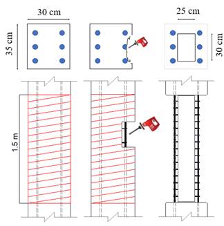 Para a realização das reparações, foi necessário estabelecer os critérios com que seriam realizadas. No caso desta estrutura, existiam elementos de diferentes dimensões, para os quais foram estabelecidos critérios universais de reparação, mas deviam ser verificados antes da sua execução. Um RPU pode ou não ser grande em relação ao tamanho do elemento. Porém, neste caso e para não recorrer a materiais, mão-de-obra e tempo como é o caso da instalação das escoras de estabilização, determinou-se pela praticidade que o melhor era efetuar as reparações em seções de 1,5 metros lineares. A seguir está um exemplo de um pilar do tipo retangular. O pilar típico (ver Fig. 5) tinha seção transversal de 30x35 cm e com o auxílio dos ensaios mecânicos realizados foi possível obter a resistência média à compressão do concreto, que é superior a 200 kgf/cm2. Considerando a seção transversal do elemento e a resistência mínima obtida, pode-se deduzir que o pilar é capaz de suportar uma carga axial de 210 t. Agora, se o concreto em mau estado for escarificado, e for reparado além da armadura, lembrando que o reparo profundo uniforme é aquele que ocorre além de 3 cm ou atrás da armadura, a nova seção transversal do elemento é de 25x30 cm. Se for utilizada esta nova seção transversal e a resistência à compressão obtida anteriormente com os corpos de prova extraídos, pode-se determinar que a estrutura, mesmo com a redução da seção de concreto, é capaz de ainda suportar 150 t. Se for considerado que, pelo menos, o elemento foi projetado com FS de 1,5, então a estrutura foi inicialmente projetada para suportar com segurança uma carga de 140 t. Portanto, mesmo após a escarificação, o pilar a ser reparado ainda pode suportar as cargas exercidas, pois é capaz de resistir a até 150 t. Isso não poderia ser totalmente verdade, pois não se trata de uma análise que considere todos os possíveis efeitos que podem existir no momento de fazer os reparos. No entanto, é uma boa estratégia a ser realizada no campo, pois permite uma rápida apreciação de até que ponto é possível intervir sem afetar estruturalmente o elemento e poder continuar com o trabalho de reparo.