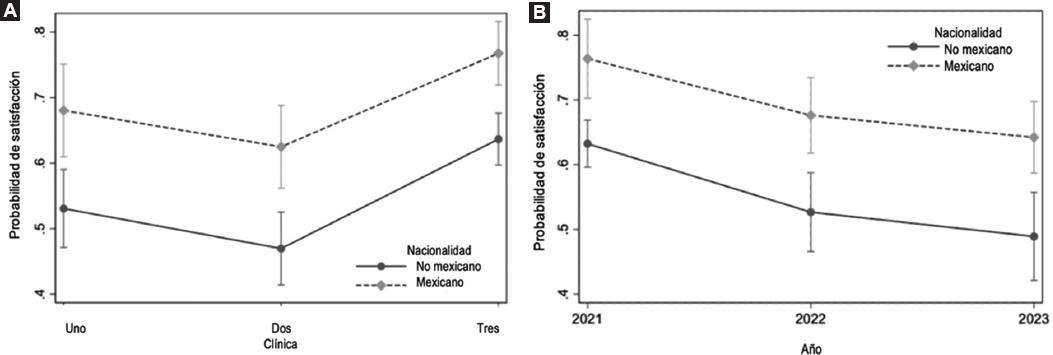 A partir de este modelo, se calculó la probabilidad de satisfacción en un análisis post hoc, tal como se muestra gráficamente en los resultados. Se obtuvieron diferencias estadísticamente significativas en la probabilidad estimada de experimentar satisfacción cuando los médicos tratantes eran mexicanos versus cuando no lo eran, tanto por clínica como por año de medición (Figuras 1A y 1B).