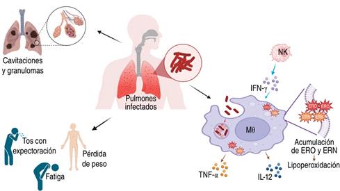 La tuberculosis afecta principalmente a los pulmones, pero puede afectar otros sitios del cuerpo, cuando la micobacteria ingresa al tejido pulmonar, las células presentadoras de antígeno liberan interleucinas (IL) -6 y -12, seguido de la producción de interferón gamma (IFN-γ), IL-23, IL-1β e IL-17 por parte de los linfocitos, lo que provoca la activación de los macrófagos, que a su vez producen factor de necrosis tumoral-alfa (TNF-α), y promueven la eliminación de las micobacterias intracelulares. Los macrófagos inducen la producción de péptidos y proteínas antimicrobianas, así como especies reactivas de oxígeno y nitrógeno (ERO y ERN) como mecanismo de defensa.1 Cuando la producción de ERO y ERN es continua y exacerbada, conduce a una inflamación crónica en el tejido pulmonar creando estrés oxidante, necrosis y cavitaciones en el tejido pulmonar.2 Las micobacterias que logran evadir la respuesta inmune penetran a los macrófagos no infectados y se replican dentro de éstos, formando un granuloma en los pulmones.3