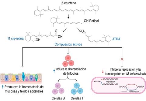 Figura 2: Efecto de la vitamina A durante la tuberculosis. El 11 cis-retinal y el ATRA (ácido transretinoide) son compuestos activos derivados del retinol. Estos compuestos permiten la homeostasis de mucosas y tejidos epiteliales durante una infección, promueve la diferenciación de linfocitos e inhibe la replicación y la transcripción bacteriana.