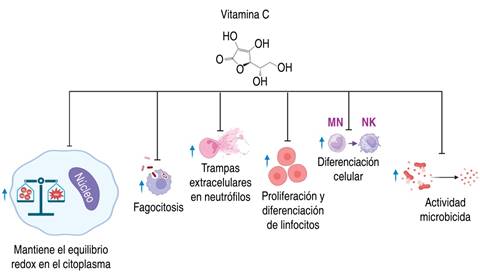 La vitamina C posee un papel importante en el sistema inmunológico, ya que induce la actividad microbicida, la migración celular, la fagocitosis y la generación de trampas extracelulares en neutrófilos, induce la diferenciación de células natural-killer,22 incrementa la proliferación de los linfocitos.23
