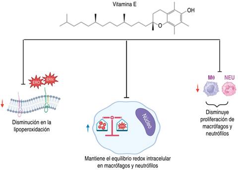 La vitamina E es un importante antioxidante, que se encuentra principalmente en las membranas celulares, tiene una función protectora en contra de la lipoperoxidación, puesto que la oxidación de las lipoproteínas de baja densidad provoca un aumento en la captación de colesterol por los macrófagos, aumentando los productos de lipoperoxidación y estimulando los procesos ateroescleróticos.27 Por ello, la función protectora de la vitamina E desempeña su papel esencial al disminuir los radicales libres de la membrana, evitando el flujo al citoplasma y daño intracelular.28 Se ha demostrado que la vitamina E inhibe la actividad de la proteína quinasa C (PKC) al aumentar la desfosforilación de PKC-α mediante la activación de la proteína fosfatasa A2, lo cual genera que se inhiba la agregación plaquetaria, se reduce la proliferación de macrófagos, neutrófilos y células del músculo liso vascular. También se ha observado una disminución en la producción de superóxido en neutrófilos y macrófagos.29