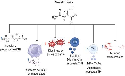 Se ha demostrado que NAC disminuye la respuesta de citocinas tipo TH2,31 reduce la producción de IL-4 y la respuesta humoral.33 En otro estudio, NAC favorece la respuesta TH1, induce la producción de IFN-γ, contribuye al control de la replicación de las micobacterias y mejora la eficacia de los fármacos antituberculosis.31