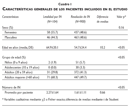 Los resultaron evidenciaron que la tasa general de letalidad por IN anual 2013 fue de 10.4%, por lo que se encontraron aislamientos de microrganismos asociados como P. aeuroginosa, Staphylococcus sp, Acinetobacter sp, (en orden de frecuencia). El comportamiento mensual de la tasa de incidencia de letalidad por IN tuvo un comportamiento discreto durante el año con picos máximos hacia finales del mismo, con una tasa mínima de letalidad por IN de 3.7% y una máxima de 21.2%. El mapeo hospitalario de la tasa de letalidad por IN demostró que en el piso 1 se presentó la tasa de letalidad anual por IN más alta de todo el hospital, lo que se atribuye a la ubicación del área de terapia intensiva. Al piso 1 siguieron los pisos donde se hospitalizan pacientes de subespecialidades de medicina interna, en contraste con áreas de obstetricia y ginecología con tasas de letalidad de 0.0%. El riesgo de letalidad según sexo no resultó significativo; no obstante, el grupo de edad con mayor riesgo de letalidad por IN fue el de mayores de 60 años (valor p<0.05), con lo que se encontró que los pacientes que tuvieron letalidad por IN fueron 10 años mayores que quienes egresaron con IN solucionada (valor p<0.05) (cuadro I).