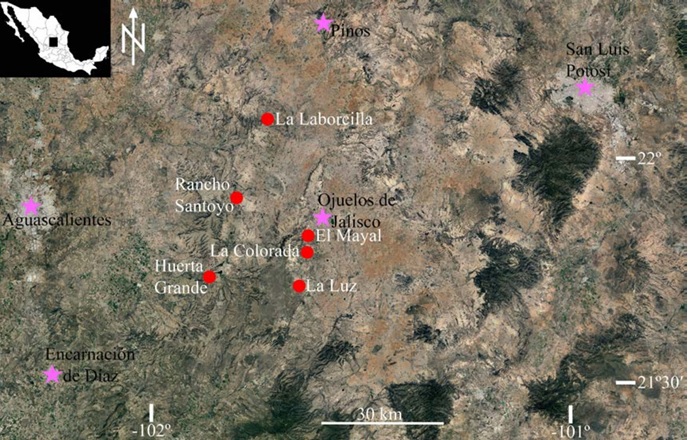 Figure 1 Localities in the Llanos de Ojuelos, Jalisco indicated in the article. Dots are our localities, and a stars indicate reference cities.