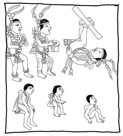 Elena Mazzetto (2021, 27-53) analizó el papel de enanos y jorobados en actividades relacionadas con el entretenimiento y como emisarios y confidentes del tlatoani, pero también por su significado simbólico como seres capaces de curar enfermedades y de mantener la comunicación entre los dioses y los hombres, al grado de que eran sacrificados para acompañar al soberano difunto en el más allá y en caso de sequías o eclipses (véanse las figuras 2 y 3).