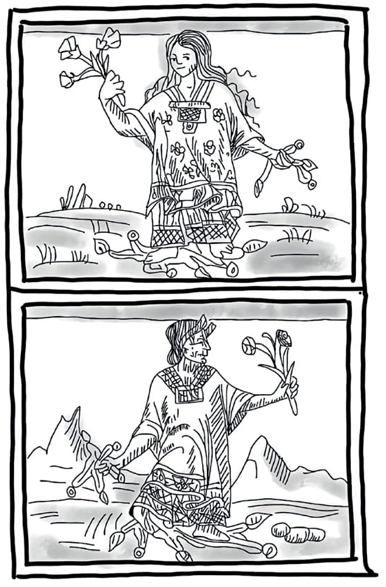 Al principio creí que la descripción “tenía vestido de pelo; tenía colgajos de cabello; bien le crecían hacia atrás; caía su cabello, su vestido de cabello” (tzotzonqueme; tzotzonquenpile; huel icuitlacaxiuhyan; huetzi in itzon, in itzonquen) (López Austin 1969, 56-57) se explicaría por su similitud con una niña; sin embargo, Alejandro Díaz Barriga Cuevas (2012, 41) afirma que las niñas tenían el cabello corto hasta los 12 años. Luego pensé en los peinados de las mujeres nahuas: algunas trenzaban su cabello para formar dos cornezuelos enfrente, pero López Hernández (2016, 133-134) indicó que otras usaban el cabello largo a los hombros o a la cintura, y suelto, así como otro tipo de peinados.25