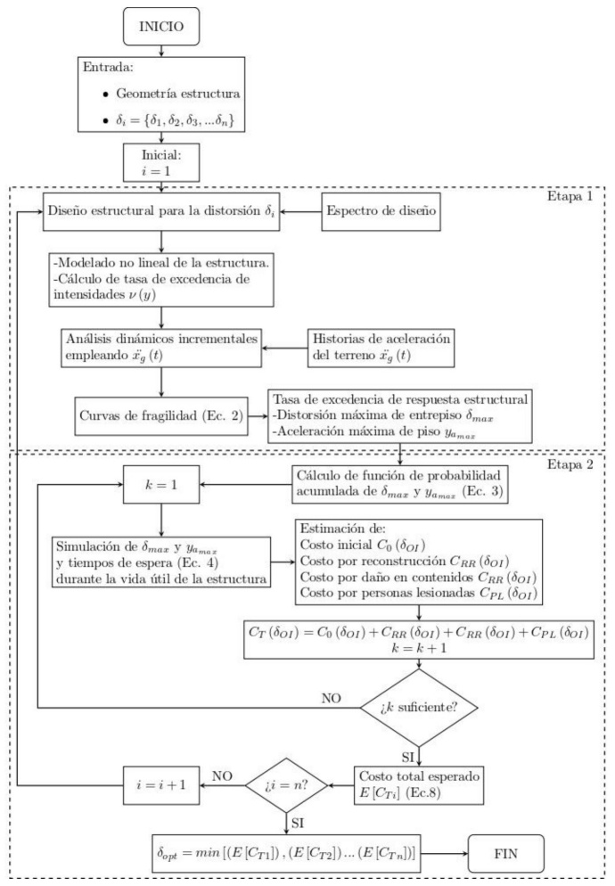 El presente artículo presenta una metodología de optimización para determinar la distorsión máxima de entrepiso de diseño que minimice el costo total esperado durante la vida útil de una estructura. Para ello, se emplea un modelo de optimización aplicado a un conjunto de edificios de uso escolar diseñados para satisfacer diferentes valores de δOI. La evaluación de cada estructura se realiza mediante un análisis de costos a lo largo del ciclo de vida de la estructura, considerando escenarios sísmicos representativos del sitio donde se ubican los edificios, y cuantificando las pérdidas económicas derivadas de los daños en sus contenidos.