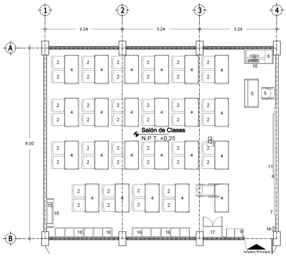 Para el diseño de los espacios y servicios que conforman los planteles educativos se utilizan los criterios normativos elaborados por el Instituto Nacional de la Infraestructura Física y Educativa, (INIFED, 2016). Se considera un inventario correspondiente a un aula de 77.76 m² (ver figura 11). Las características de los contenidos para este inventario se presentan en la tabla 3. El costo esperado por daño en contenidos de este inventario se presenta en la figura 12. Se consideran 5 aulas por nivel. La función del costo total se presenta en la figura 13. El costo total por reemplazo, considerando 25 aulas, asciende a $2,759,025.00 ($133,205.73 USD).