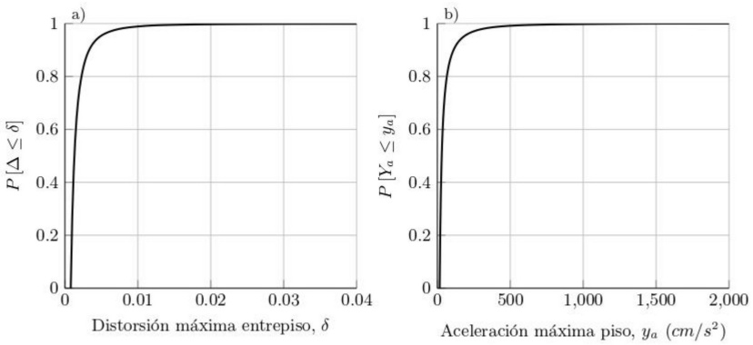 Figura 14 Funciones de probabilidad acumuladas a) Distorsión máxima de entrepiso; b) Aceleración máxima de piso