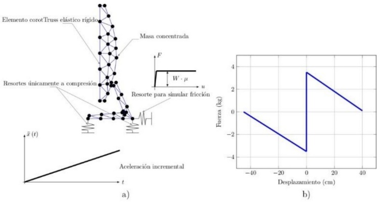 Figura 2 a) Modelado de contenido, representado en OpenSees, b) Curva esfuerzo-desplazamiento de un contenido