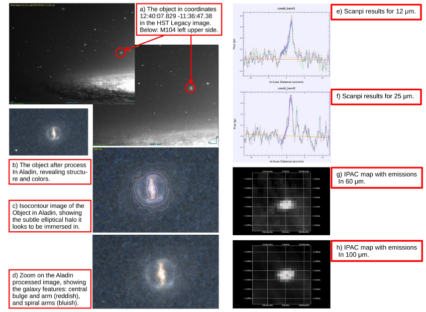 In addition, the approximately circular object (which appears to be face-on) has a subtle elliptical halo twice its size (Figure 1c), possibly a feature of the PSF due to the low signal-to-noise ratio in the area. The author obtained an IPAC map (with data from the Spitzer Space Telescope, Wide-field Infrared Survey Explorer WISE) showing emissions at 60 and 100 micrometers, within an approximate radius of 7 arc seconds around the coordinates of the object (Figures 1g and 1h), which is 4 arc seconds wide; it shows that the halo has an infrared emission, which is not a feature of the PSF. In Figure 1e, Scanpi results for the object show a flux gap at 12 micrometers (silicate absorption feature), which may be indicative of an AGN Seyfert galaxy (Köhler & Li 2010, Hao et al. 2007). Also shown in Figure 1f are the Scanpi results at 25 micrometers, which show a peak. The 25 micrometers emission is a good measure of AGN luminosity (Severgnini et al. 2012). The WISE satellite offers a spatial resolution of approximately 6 arcsec 3 while Spitzer provides about 2 arcsec 4, so it is probable that the origin of the infrared emission is the galaxy, not the halo.