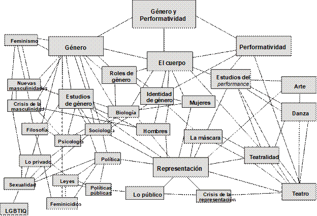 A continuación, para situarnos, presento un diagrama de redes. En él se puede desplegar de manera visual la interconexión que existe principalmente entre los nodos género y representación,6 que serán los dos principales conceptos desde donde me coloco para analizar el objeto de estudio.