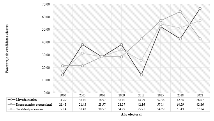 Figura 1 Porcentaje de diputadas electas en el congreso de Campeche, 2000-2021