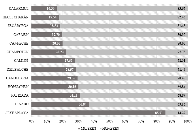 Ahora bien, en Carmen y Hopelchén ha habido por lo menos una mujer participando en ocho de las nueves elecciones desarrolladas en cada municipio. Mientras tanto, en Palizada y Calakmul ha habido competencias exclusivamente protagonizadas por hombres en más de la mitad de las ocasiones.