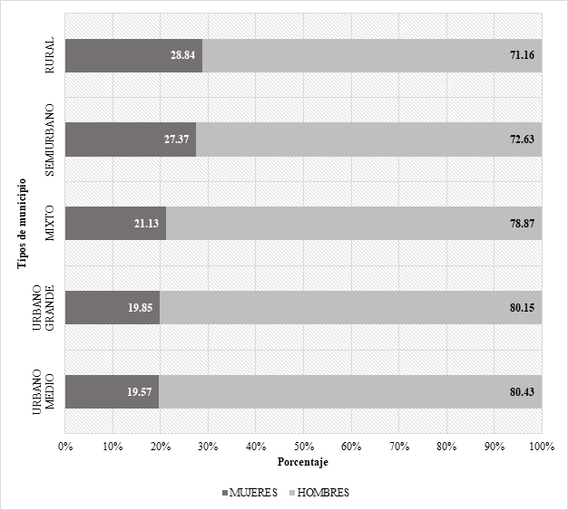 Figura 3 Distribución porcentual de mujeres y hombres en el total de candidaturas postuladas entre 1997 y 2021, por tipo de municipio
