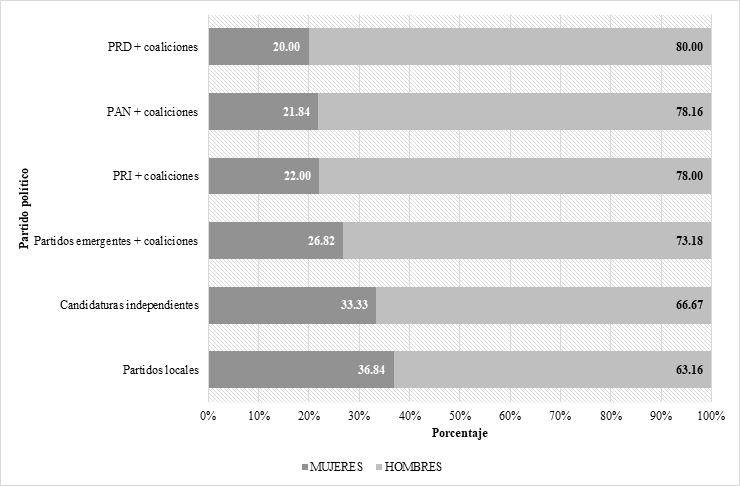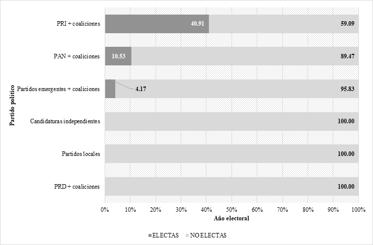 Así, sin la obligatoriedad de las medidas de acción afirmativa, la representación política de las mujeres no alcanzó siquiera el 30% del total de candidaturas postuladas por cada partido en ninguna de las elecciones celebradas entre 1997 y 2015. Dicho umbral fue superado sólo en el año 2000, gracias al predominio del partido oficial. A partir de entonces, la competitividad electoral se incrementó y generalizó, pero no así las candidatas que encabezaron las planillas de ayuntamientos.