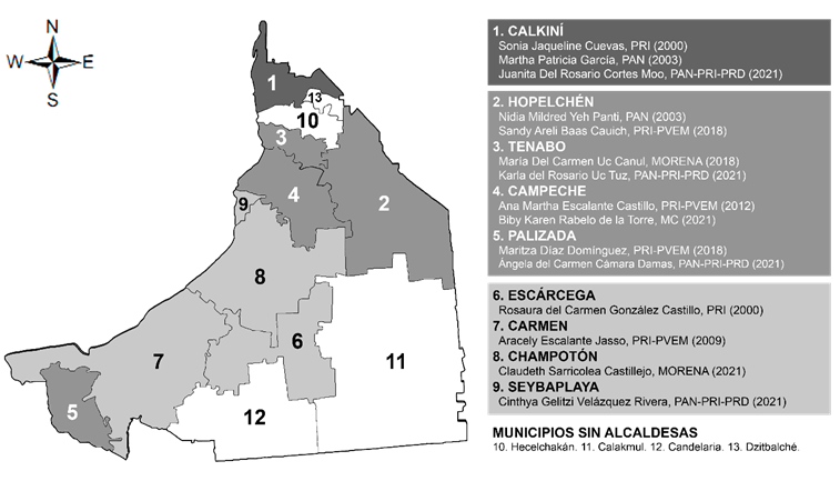 Fuente: elaboración propia con datos del Instituto Electoral del Estado de Campeche (s/f) y del Instituto Nacional para el Federalismo y el Desarrollo Municipal (s/f).