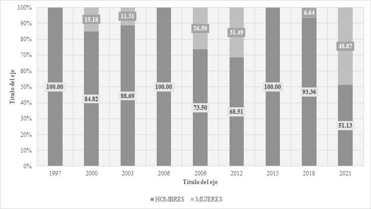 Figura 2 Distribución porcentual de mujeres y hombres en el total de candidaturas postuladas entre 1997 y 2021