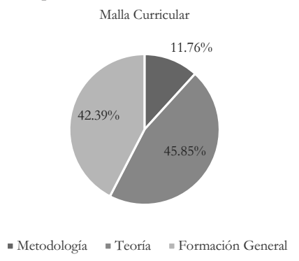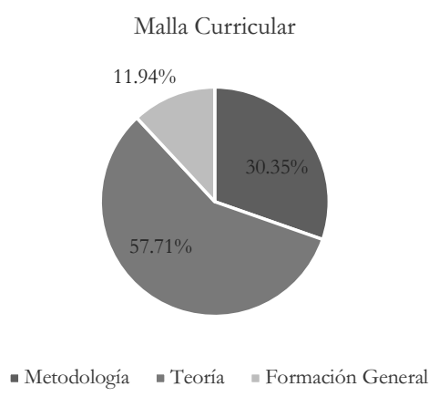 En lo que se relaciona con la composición de las mallas curriculares, del análisis realizado y que consta en la Gráfica 1, se desprende que el componente principal es la formación en cursos teóricos (45,85 %). A lo dicho siguen las materias correspondientes a la formación general, entre las que se encuentran algunas relacionadas con principios de economía, sociología, derecho o historia (42.39 %). En cuanto a los cursos de naturaleza metodológica son menos frecuentes y allí se observa un tema que podría afectar al desarrollo de la disciplina (11.76 %). De hecho, al carecer de bases metodológicas, la producción científica se restringe y eso es evidente en los programas de posgrado, ya que allí no es posible desarrollar agenda de investigación más avanzadas sino que es necesario cubrir los vacíos detectados en el nivel de licenciatura.