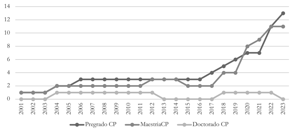 En cuanto a los estudios de doctorado, Ecuador cuenta con tres programas: uno tiene énfasis en los estudios internacionales, otro en políticas públicas y el tercero en ciencia política. Todos están ofertados por Flacso-Ecuador. No obstante, hay que señalar que existen otros programas interdisciplinarios en los que la política se encuentra como un eje transversal. Ese es el caso del Doctorado en Estudios Latinoamericanos, ofrecido por la Universidad Andina Simón Bolívar. En ambas universidades se ofrecen becas y condiciones óptimas para los doctorandos aunque con una limitante relacionada con la ausencia relativa de vasos comunicantes entre un programa y otro. En ese panorama, hay un tema a tratar y que podría ayudar en gran medida a mejorar el entorno y producción científica de la ciencia política ecuatoriana. La Gráfica 3 resume la evolución a lo largo del tiempo analizado de los programas de pregrado y posgrado en Ciencia Política que se ofrecen en Ecuador.