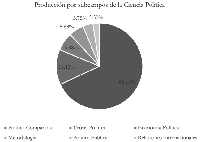 Para identificar los subcampos de la ciencia política en los que se sitúan las publicaciones recurrimos a la división más tradicional dentro de la disciplina (Roskin, 2023; Kaufman-Osborn, 2006; Grant, 2005). De allí consideramos seis espacios medianamente diferenciados: política comparada, relaciones internacionales, política pública, metodología, economía política y teoría política. Conforme se observa en la Gráfica 4, más de dos tercios de las publicaciones se centran en estudios de política comparada (68.12 %), mientras que la porción restante está compuesta por trabajos que se inscriben en los demás subcampos. Aunque se podría creer, en principio, que la comparación está ausente en las investigaciones que no son parte de las incluidas en el subcampo de la política comparada, en realidad esta es una conjetura que no es del todo cierta. Por ejemplo, algunos trabajos desde las relaciones internacionales comparan políticas de seguridad o de comercio de varios países, con lo que la aplicabilidad del método al que Sartori (1994) consideró la mejor forma de acercarse a la realidad desde lo cuasi experimental, está presente.