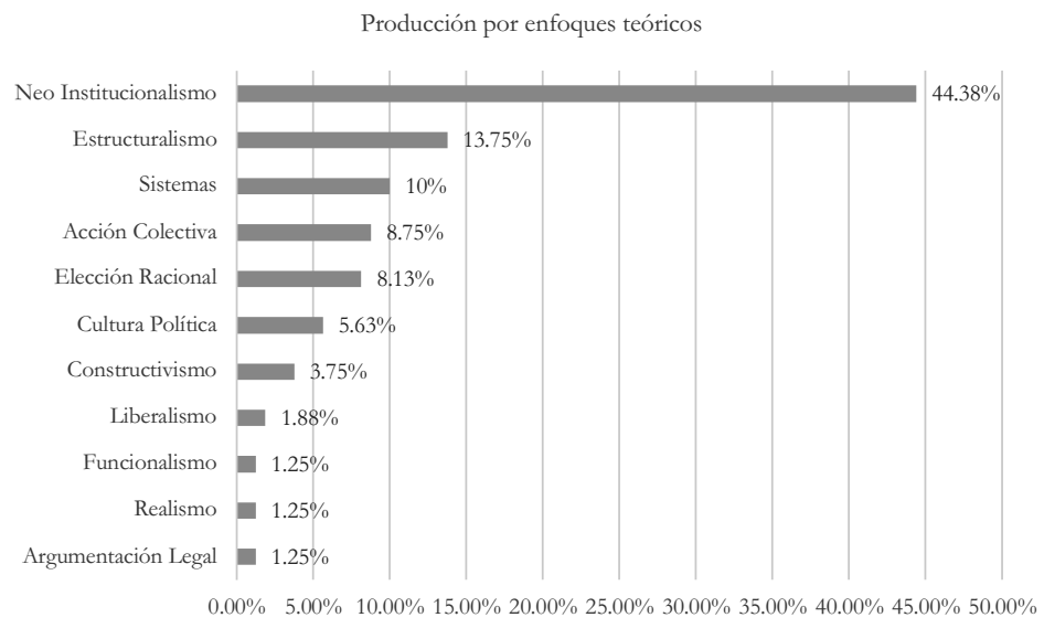 En cuanto a los enfoques teóricos más utilizados por los politólogos ecuatorianos, los más prevalentes son el neoinstitucionalismo en sus distintas variantes, el estructuralismo marxista y sus derivados, y los enfoques sistémicos, principalmente los que corresponden al legado de la escuela italiana. De igual manera, hay interés en los estudios de acción colectiva, sobre todo para los trabajos sobre movimientos sociales y también en los que se sustentan en la teoría del elector racional, tanto en su versión clásica como en la modificada (bounded rationality). Entre los enfoques menos utilizados se hallan los que provienen de la cultura política en sus variantes cuantitativas vía encuestas o cualitativas a través de análisis de discurso y algunos que se anclan en teorías constructivistas. La Gráfica 6 sitúa al lector en la descripción previamente expuesta.