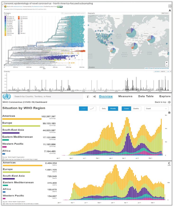 Figure 2 Public web platforms developed for SARS-CoV-2/COVID-19. A. Phylogeny, phylogeography and virus diversity generated by GISAD (www.gisaid.org). B. COVID-19 pandemic traceability reported from January to October 2021 by John Hopkins University, USA (https://coronavirus.jhu.edu/map.html). Number (x1000) of positive cases by WHO regions. C. Number of death cases by regions.