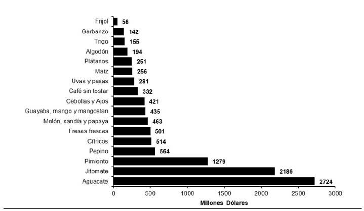 Figure 3 Mexican agricultural products with the highest export values in 2020. Units in millions of dollars. Data source: SIAP, (2021).