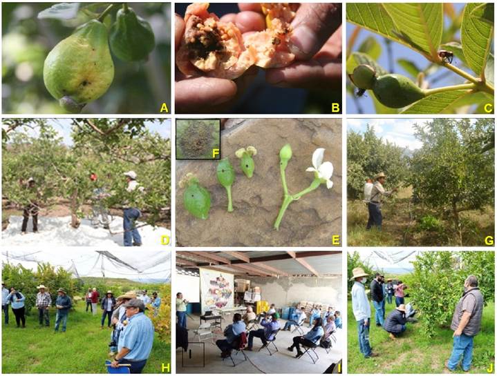 Figura 1 Durante la pandemia COVID 19, el manejo de las principales enfermedades y plagas, como el picudo de la guayaba (Conotrachelus dimidiatus) fueron afectadas. Por ejemplo, esta plaga si no se controla ocasiona 60% de daño: Apariencia externa (A) e interna de fruto dañado (B) y tamaño de fruto afectado (C). Los adultos son difíciles de observar, por lo cual se realiza el manteo (D) y el ‘escauteo’ o revisión de frutos por daños de alimentación (E). El inicio de las actividades de manejo ocurre cuando se observan los primeros frutos con daños de ovoposición (F). Preponderantemente se aplican productos de síntesis química (G). La capacitación de productores y técnicos fue afectada por riesgo COVID-19 (H, I y J).