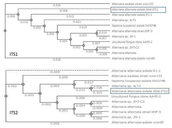 Figura 3 Construcción del árbol filogenético comparando las regiones amplificadas Altal-ITS1 y Altal-ITS2 en Alternaria alternata
