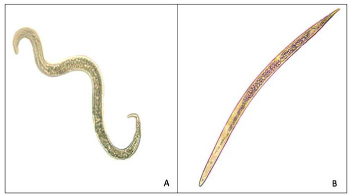 Figura 1. J2 de Meloidogyne enterolobii expuesto a H 2 O y levamisol por 24 h, observados bajo un microscopio óptico (20X). A) J2 expuesto a H 2 O y B) J2 expuesto a levamisol.