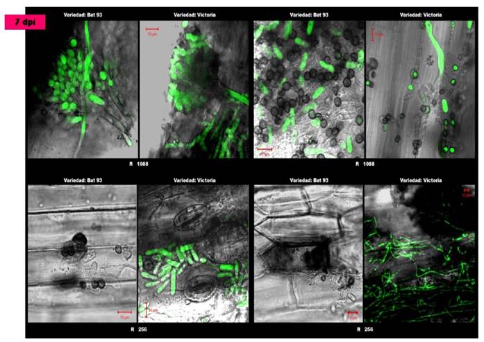 Figura 1 Análisis microscópico 7 días después de la inoculación de plántulas de frijol común con Colletotrichum lindemuthianum. En el cuadrante superior izquierdo se observa la formación de estructuras reproductivas (acérvulos) por parte del patógeno en las interacciones compatibles para ambos cultivares con la cepa 1088. Del lado derecho se muestra una gran cantidad de conidios y apresorios en la misma cepa. En las interacciones con la cepa 256 se observa gran cantidad de hifas del cultivar Victoria así como la presencia de conidios jóvenes sobre el tejido necrótico de la planta, mientras que, en el cultivar BAT 93 se observan reacciones de hipersensibilidad provocadas por la respuesta de defensa, incluyendo muerte localizada de células en contacto con el patógeno.