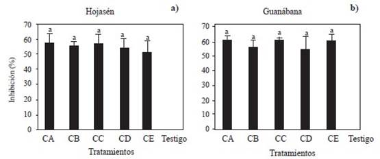Figura 3 Inhibición micelial de Alternaria alternata por 5 grupos de compuestos polifenólicos a 8000 ppm de a) hojasén (Flourensia cernua) y b) guanábana obtenidos por ultrasonido-microondas. Grupos de polifenoles CA obtenido con la relación m/v (1:16) y EtOH-70%, CB obtenido con la relación m/v (1:16) y EtOH-0%, CC obtenido con la relación m/v (1:8) y EtOH-0%, CD obtenido con la relación m/v (1:8) y EtOH-70%, CE obtenido con la relación m/v (1:12) y EtOH-30%. Columnas con la misma letra dentro de la misma gráfica, no son diferentes de acuerdo con la prueba de rango múltiple de Tukey.