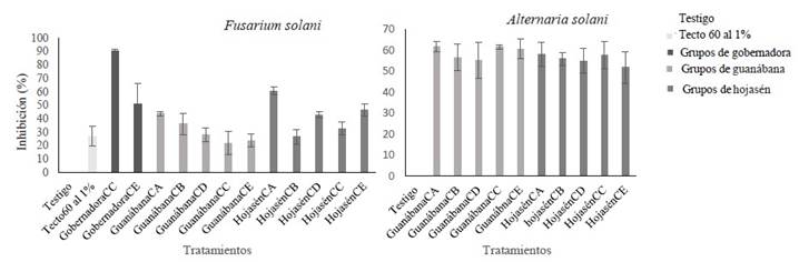 Inhibición de Fusarium y Alternaria por polifenoles de gobernadora, hojasén y guanábana. Para Fusarium, el análisis de varianza mostró diferencias en la inhibición micelial de F. solani entre los dos grupos de polifenoles (CD y CE) obtenidos de gobernadora (L. tridentata) vs testigos (negativo y positivo (tecto-60® y etanol-70%)) (Figura 2a). Se apreció que a 8000 ppm los polifenoles obtenidos con la relación m/v 1:8 y etanol 70% (CD), inhibieron el crecimiento micelial en 90 %, mientras que los polifenoles obtenidos con la relación m/v 1:12 y etanol 30%, y el testigo positivo (Tecto 60® (tiabendazol) al 1%) solo inhibieron el crecimiento micelial en 50% y 27 %, respectivamente. Los resultados de este estudio coinciden con los reportados por Peñuelas-Rubio et al. (2017) quienes mencionan que extractos a 500 ppm y obtenidos por el sistema Soxhlet y etanol 70%, inhibieron F. oxysporum en un 98%, sin embargo, en el presente trabajo se necesitaron 8000 ppm de polifenoles para inhibir el crecimiento micelial en 90%, cuando los polifenoles se extrajeron con EtOH-70% y 50% cuando se usó EtOH-30%. En este estudio los polifenoles se extrajeron en 20 minutos usando simultáneamente ultrasonido-microondas, mientras que la extracción empleando Soxhlet tarda al menos 36 horas (Sepúlveda-Rincón et al., 2016).
