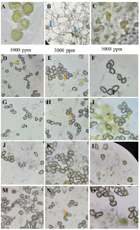 Figura 1 Efecto de extractos vegetales en uredosporas de Hemileia vastatrix. A) Uredosporas de H. vastatrix sin tratamiento; B) Testigo, la flecha de color azul muestra los tubos germinativos de H. vastatrix. C) Blanco (Oxicloruro de cobre) inhibe la germinación de H. vastatrix. D-F) Extracto A. indica etanólico; G-I) extracto A. indica apolar; J-L) Extracto P. auritum etanólico; M-O) extracto P. auritum apolar (40X), las flechas amarillas señalan despigmentación de H. vastatrix y sin germinación.