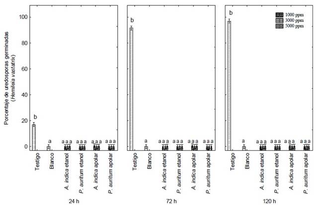 Figura 2 Porcentaje de germinación de uredosporas de Hemileia vastatrix ante la acción de extractos etanólicos y apolares de Piper auritum y Azadiractha indica, y oxicloruro de cobre (Blanco) durante las 24 h, 72 h y 120 h de exposición. Las letras indican diferencias significativas entre las medias (Tukey, P ≤ 0.05).
