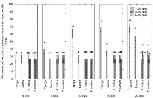 Figura 3 Porcentaje de severidad de H. vastatrix en hojas de café Typica tratadas con extractos etanólicos foliares de A. indica y P. auritum durante 20 días de tratamiento. En el título del eje Y: Severidad de Hemilea vastatrix (%). Las letras indican diferencias significativas entre las medias (Tukey, P ≤ 0.05).