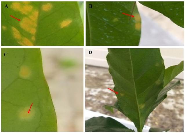 Figura 4 Efecto de la aplicación de oxicloruro de cobre y extractos de Azadirachta indica y Piper auritum en hojas de café Typica. A) Testigo, flechas rojas indican la infección de H. vastatrix; B) Oxicloruro de cobre, manchas amarillentas; C y D) Hojas de café tratadas durante 15 días con extracto de A. indica y P. auritum (las flechas rojas señalan el daño ocasionado por la infección inicial, así como la ausencia de uredosporas debido a la aplicación de los extractos vegetales).