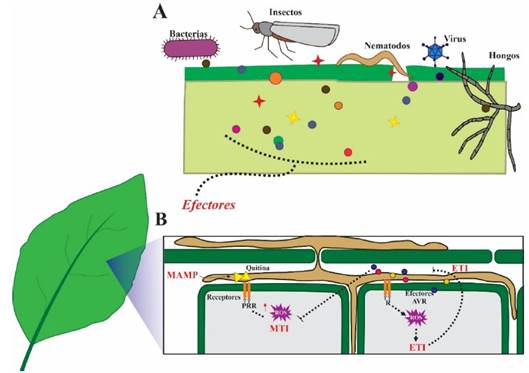 Figura 1 Interacción patógeno-hospedero. A) Efectores, las armas moleculares de fitopatógenos y plagas. Las bacterias, hongos, oomicetos, virus, insectos y nematodos son capaces de secretar una plétora de efectores hacia el hospedero, que les permiten impedir su reconocimiento por la planta, bloquear la respuesta inmune y favorecer su propio desarrollo. B) Por su parte, las plantas, en la primera línea de defensa, reconocen “patrones moleculares asociados a microorganismos” (MAMP, por sus siglas en inglés), que son moléculas conservadas, como la quitina de los hongos y activa el mecanismo de defensa MTI. En otra línea de defensa vegetal, las proteínas de resistencia (R) reconocen los efectores Avr del patógeno, lo que induce la respuesta de hipersensibilidad y la muerte localizada de las células del hospedero para contener la infección (ETI). Cuando las proteínas R son incapaces de reconocer al efector, se desarrolla la susceptibilidad mediada por el efector y se establece la enfermedad.