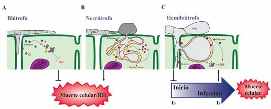 Figura 3 Funcionalidad biológica de efectores según los hábitos tróficos de los diferentes tipos de fitopatógenos. A) en los biótrofos, los efectores bloquean la respuesta hipersensible y suprimen la respuesta de defensa vegetal. Los efectores biotróficos mantienen vivas las células del hospedero. Ejemplos de organismos biotróficos son los hongos Ustilago maydis, Blumeria graminis y Puccinia triticina. B) los necrótrofos liberan efectores que causan la muerte celular a través de necrosis, fagocitosis, etc. Ejemplos de organismos necrotróficos son los hongos Botrytis cinerea y Alternaria brassicicola, y la bacteria Rhizobium radiobacter. C) Los hemibiótrofos poseen ambos tipos de efectores. En el inicio de la interacción emplean efectores expresados en la fase biotrófica que evitan la muerte celular por RH; al final de su ciclo de vida, emplean los efectores asociados a la fase necrotrófica, que provocan la muerte de su hospedero. Ejemplos de organismos hemibiotróficos son los hongos Colletotrichum graminicola, Cladosporium fulvum, el oomiceto, Phytophthora infestans y la bacteria Pseudomonas syringae.