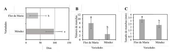 La variedad Flor de María fue la primera en presentar síntomas con un promedio aproximado de 41 días. Mientras que, Méndez presentó síntomas a los 91 días. Esta variedad también presentó mayor número y tamaño de manchas, con un promedio de 7-8 manchas y un tamaño promedio de 3 mm; y en el caso de la variedad Méndez presentó un promedio de 2-3 manchas y un tamaño promedio de 2 mm, esto al mes de haberse observado la presencia de síntomas (Figura 2).