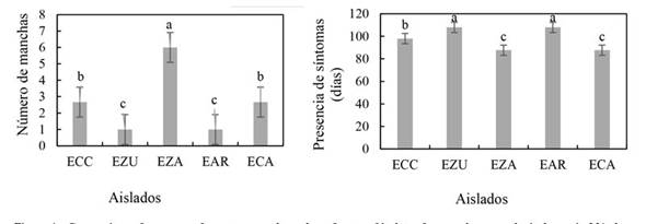Figura 4 Comparación de presencia de síntomas y número de manchas de los aislados de cada área agroecológica en variedad Méndez. Valores promedio ± desviación estándar. Letras diferentes indican diferencias estadísticamente significativas de acuerdo con la prueba de Tukey (α = 0.05).