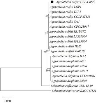 La secuencia del aislamiento CEP-ChSr7 se depositó en el GenBank con el número de acceso PV569903. El análisis BLAST de la secuencia parcial ITS (674 pb) mostró una similitud del 100 % con aislamientos de Agroathelia rolfsii (Sclerotium rolfsii) (GenBank: OM647806, OM729592) (Balamurugan et al., 2022; Sun et al., 2023). El análisis diagnóstico/filogenético se muestra en Figura 1. El aislamiento seleccionado a partir de esta investigación identificado como Agroathelia rolfsii CEP-ChSr7 se indica con un círculo negro y está agrupado en el clado A. rolfsii. S. cepivorum se utilizó como grupo externo.