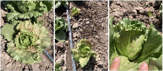 Figura 1 Plantas de lechuga sintomáticas infectadas con Orthotospovirus impatiensnecromaculae observadas durante el estudio de campo.