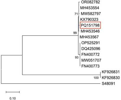 Figura 2 Árbol filogenético de máxima verosimilitud de múltiples aislados de Orthotospovirus impatiensnecromaculae (Impatiens necrotic spot virus, INSV) disponibles en GenBank. Secuencia generada durante este estudio es indicada con rojo. GenBank: S48091 corresponde a el Orthotospovirus tomatomaculae (tomato spotted wilt virus, TSWV) y es incluido en el análisis filogenético como grupo externo.