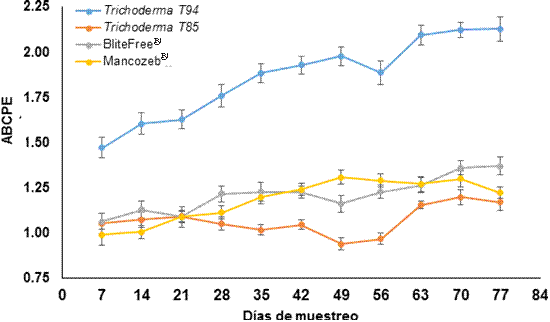 Área bajo la curva del progreso de la enfermedad. La Figura 1 presenta la suma general del ABCPE de la Sigatoka negra en banano cv. Gran enano, durante los 12 muestreos (84 días). Trichoderma T-85 estadísticamente (F=153.01, p=0.0001) obtuvo la menor ABCPE con 11.76, en comparación con los otros tratamientos, los cuales presentaron valores de 13.32 (Blitefree®), 13.03 (Mancozeb®) y 20.49 (Trichoderma T-94). La Figura 2 reafirma los resultados; se puede observar que Trichoderma T85. a partir del quinto muestreo (35 días), presentó el menor ABCPE, muy por debajo del tratamiento químico. El tratamiento de Trichoderma sp. T-94 obtuvo la mayor ABCPE distinguiéndose desde el primer monitoreo (7 días) ante los demás tratamientos. Mancozeb® presentó valores más bajos de ABCPE (F=153.01, P=0.0001) comparado con Blitefree® en los muestreos a 14, 28, 49 y 77 días.