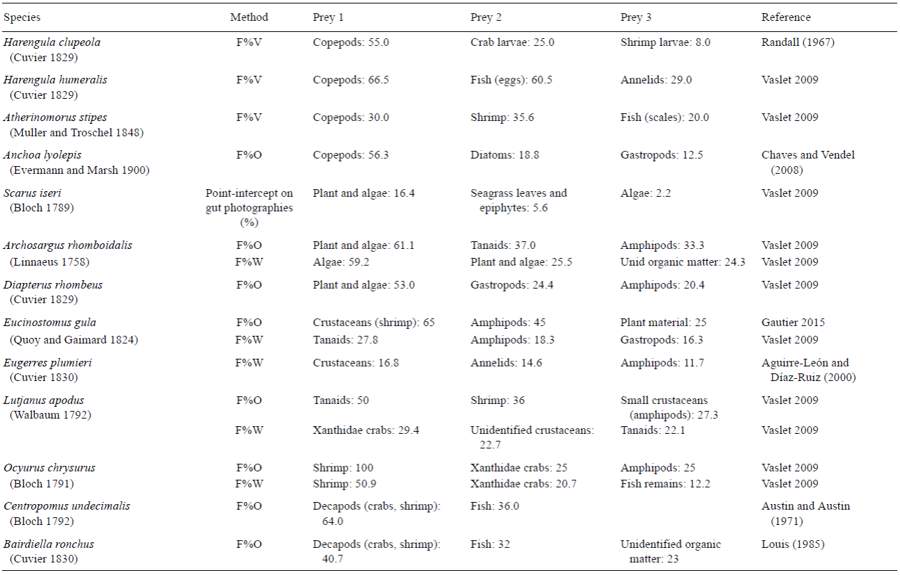 Las especies de peces se asignaron a cuatro gremios tróficos con base en el análisis de su contenido estomacal (Tabla 1) y una revisión de la literatura de dietas de peces (Randall 1967, Austin y Austin 1971, Aguirre-León y Yáñez-Arancibia 1984, Bouchon-Navaro et al. 1992, Sierra et al. 1994, Nagelkerken et al. 2006, Chiaverini 2008): herbívoros que consumen algas y hojas de pastos marinos y sus algas epifitas; omnívoros que consumen invertebrados y por lo menos 10% de algas; planctívoros que consumen zooplancton; y carnívoros que consumen invertebrados bentónicos y algunas especies de peces.