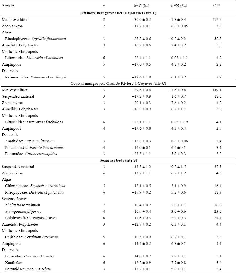 Tabla 2: Valores medios de 513C y 515N (± desviación estándar) y razones C:N de las fuentes de alimento de peces provenientes de manglares y pastos marinos (n, número de muestras). Ver la figura 1 para la ubicación de los sitios de muestreo.